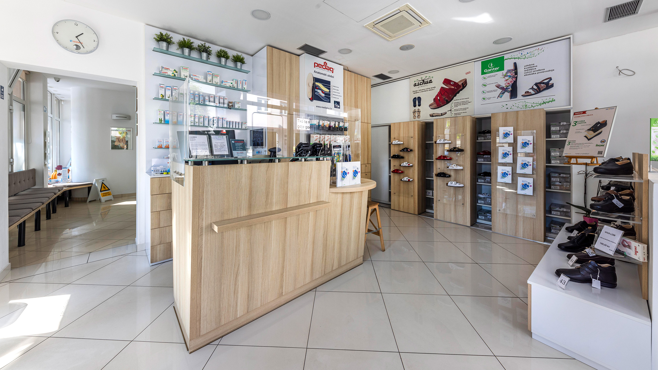 Na ulazu u salon nalaze se recepcija te specijalizirana trgovina Fit2Feet u kojoj možete pronaći brojne proizvode namijenjene stopalima. U ponudi su udobna anatomska obuća, obuća za dijabetičare, standardizirani anatomski ulošci i oni rađeni po mjeri, specijalna kozmetika za stopala, proizvodi za korekturu i otklanjanje pritiska na stopalima i drugo.